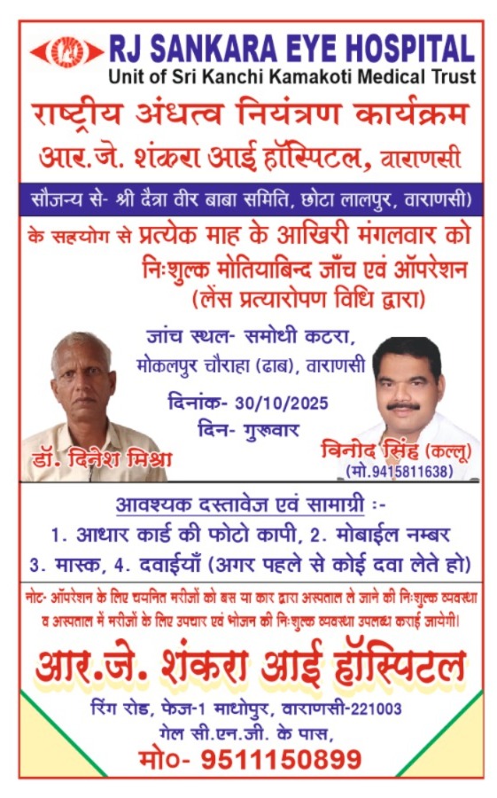 वाराणसी। राष्ट्रीय अंधत्व नियंत्रण कार्यक्रम के तहत नेत्रहीनता को दूर करने के उद्देश्य से, आर.जे. शंकरा आई हॉस्पिटल (श्री कंची कामकोटि मेडिकल ट्रस्ट की एक इकाई) ने एक विशाल निःशुल्क मोतियाबिंद जाँच एवं ऑपरेशन शिविर का आयोजन करने की घोषणा की है। यह शिविर आगामी 30 अक्टूबर 2025, गुरुवार को आयोजित किया जाएगा, जिसे श्री दैत्रा वीर बाबा समिति, छोटा लालपुर, वाराणसी का सहयोग प्राप्त है।