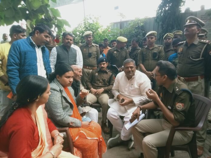 मौके पर पहुंचे डीसीपी गोमती जोन आकाश पटेल,एडीसीपी वैभव बांगर, एसीपी अजय कुमार श्रीवास्तव से वार्ता करते भाजपा के एमएलसी धर्मेंद्र राय, जिला पंचायत अध्यक्ष पूनम मौर्या, सेवापुरी विधायक प्रतिनिधि अदिति पटेल।