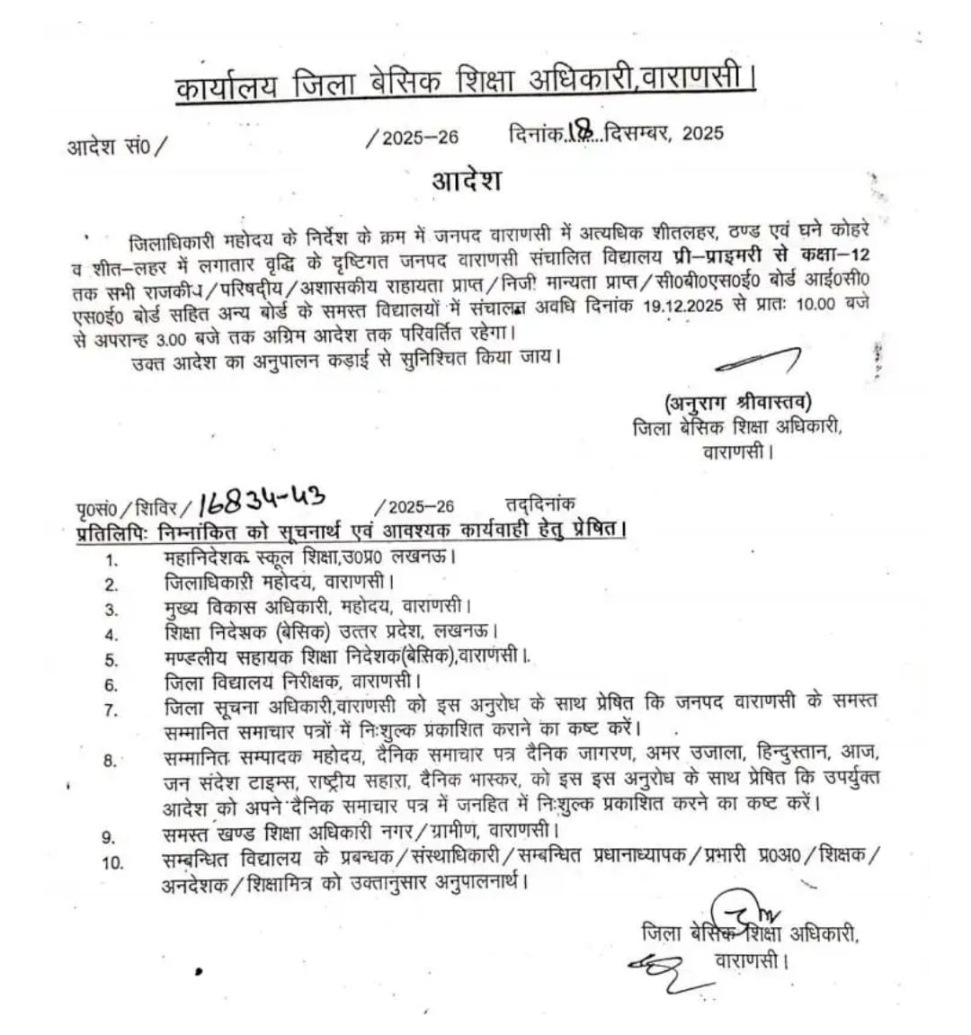 मौसम की स्थिति को देखते हुए लिया गया फैसला इन दिनों वाराणसी सहित पूर्वांचल में शीतलहर और कोहरे का प्रकोप बढ़ गया है। सुबह के समय दृश्यता कम होने और गलन अधिक होने से छोटे बच्चों को स्कूल आने-जाने में कठिनाइयों का सामना करना पड़ रहा था। इसी को ध्यान में रखते हुए शिक्षा विभाग ने स्कूलों के समय में बदलाव का आदेश जारी किया है।