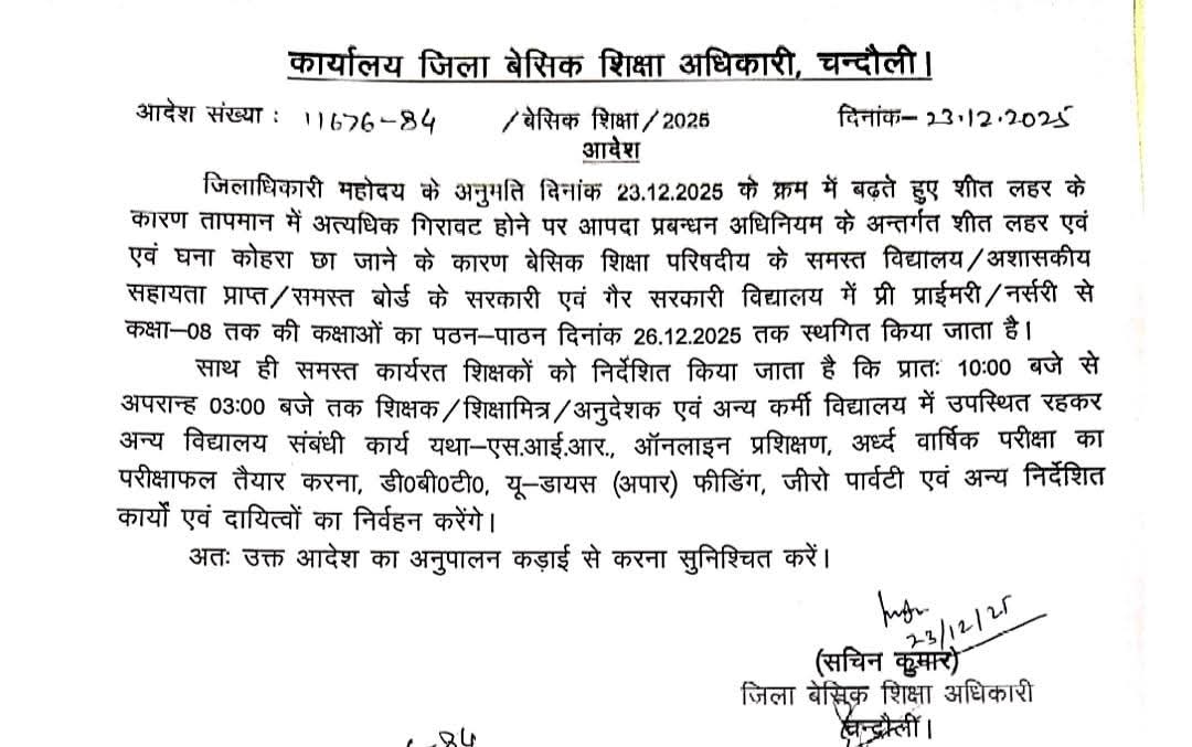 शीत लहर का असर: चंदौली में कक्षा 8 तक के स्कूल 26 दिसंबर तक बंद, शिक्षकों को निर्धारित समय पर रहना होगा उपस्थित