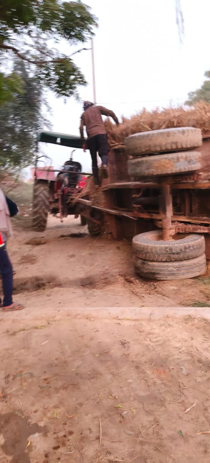 चिरईगांव: जर्जर चकरोड पर पुआल लदी ट्रैक्टर ट्रॉली पलटी, चालक ने कूदकर बचाई जान