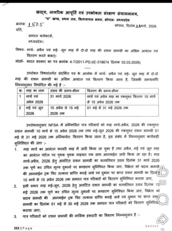 प्रदेश सरकार द्वारा पात्र परिवारोंसे को मार्च माह से दो माह का एक मुश्त राशन दिया जाएगा। आमजनों को एक बार में मार्च-अप्रैल एवं दूसरी बार में मई जून का राशन एक साथ मिलेगा। यह निर्देश खादय नागरिक आपूर्ति एवं उपभोक्ता सरंक्षण आयुक्त श्री कर्मवीर शर्मा ने जारी किए हैं। अभी तक पात्र परिवारों को उचित मूल्य की दुकान से हर माह राशन लेने के लिए जाना होता था। प्रदेश सरकार अब गर्मी के मौसम को ध्यान में रखते हुए पात्र परिवारों को एकमुश्त दो माह का राशन एक साथ देने का निर्णय लिया है। पात्र हितग्राही 10 मार्च से 15 अप्रैल तक मार्च एवं अप्रैल माह का राशन शासकीय उचित से प्राप्त कर सकते हैं, वहीं 1 मई से 31 मई तक उपभोक्ता मई एवं जून का राशन प्राप्त मिलेगा। इसकी जानकारी आमजनों तक पहुंचाने के लिए उचित मूल्य की दुकानों पर फलैक्स एवं बैनर लगाने के निर्देश भी जारी किए गए हैं।