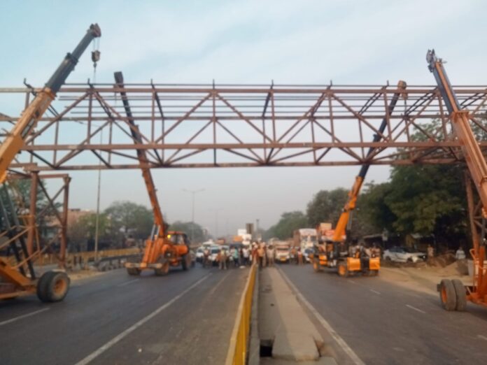 हाईवे पर फुट ओवर ब्रिज निर्माण कार्य के दौरान दो घंटा वाहनों का आवागमन रहा बाधित