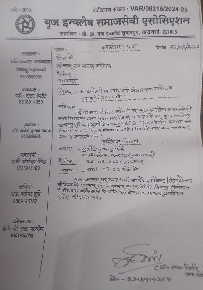 हर्ष के साथ सूचित करते हैं कि बृज इनक्लेव समाजसेवी एसोसिएशन द्वारा महानवरात्रि के पावन पर्व पर भव्य देवी जागरण एवं पत्रकार वार्ता का आयोजन दिनांक – 25 मार्च 2026, बुधवार को किया गया है।