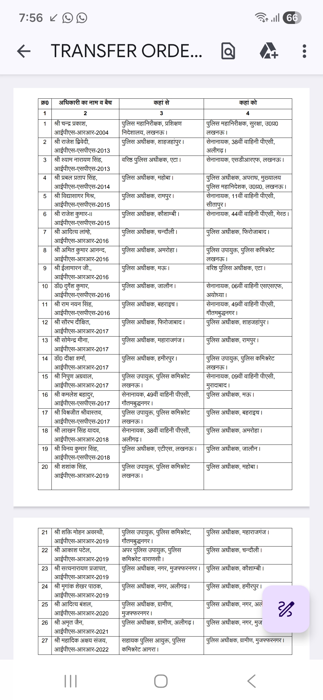 लखनऊ | उत्तर प्रदेश शासन ने रविवार देर रात राज्य की पुलिस व्यवस्था को धार देने के लिए 27 IPS अधिकारियों का बड़े पैमाने पर तबादला कर दिया है। शासन द्वारा जारी इस सूची में 20 से अधिक जिलों के पुलिस कप्तान और पीएसी (PAC) के सेनानायक शामिल हैं।