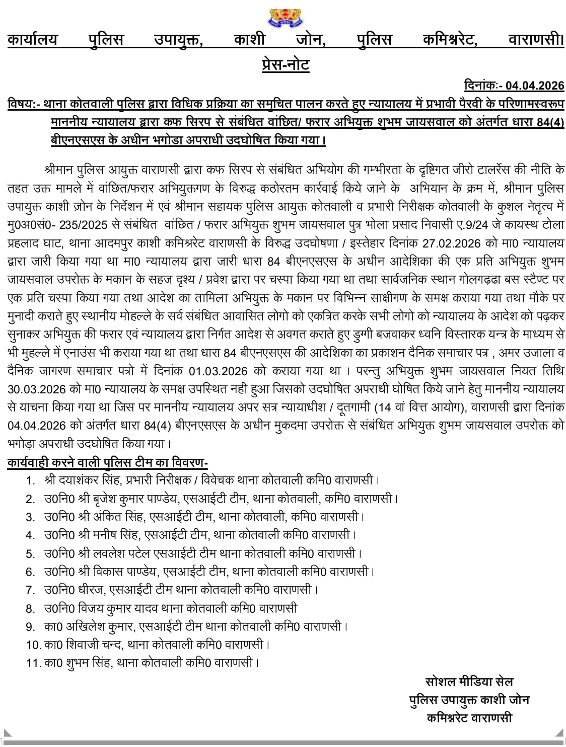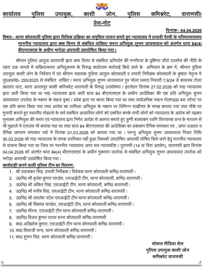 वाराणसी में कफ सिरप मामले में बड़ी कार्रवाई सामने आई है। वाराणसी पुलिस कमिश्नरेट के तहत थाना कोतवाली पुलिस की प्रभावी पैरवी के बाद फरार आरोपी शुभम जायसवाल को न्यायालय ने भगोड़ा अपराधी घोषित कर दिया है।