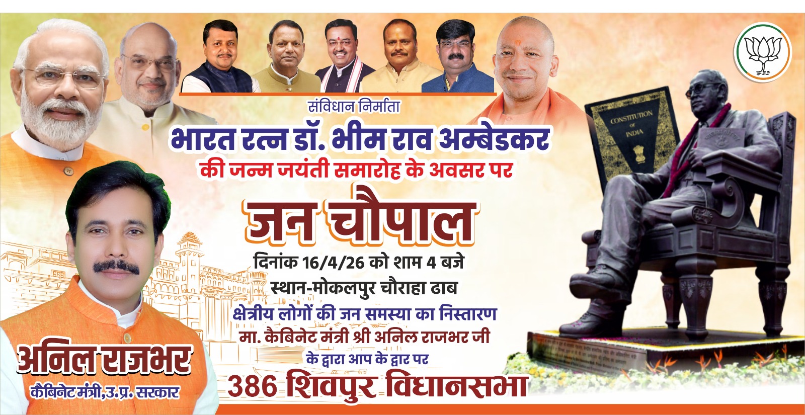 वाराणसी/शिवपुर: भारत रत्न डॉ. भीम राव अम्बेडकर की जयंती के उपलक्ष्य में आगामी 16 अप्रैल को शिवपुर विधानसभा के मोकलपुर चौराहा (ढाब) पर एक भव्य ‘जन चौपाल’ का आयोजन किया जा रहा है। इस कार्यक्रम में उत्तर प्रदेश सरकार के कैबिनेट मंत्री श्री अनिल राजभर मुख्य रूप से उपस्थित होकर क्षेत्रीय जनता की समस्याओं का मौके पर निस्तारण करेंगे।