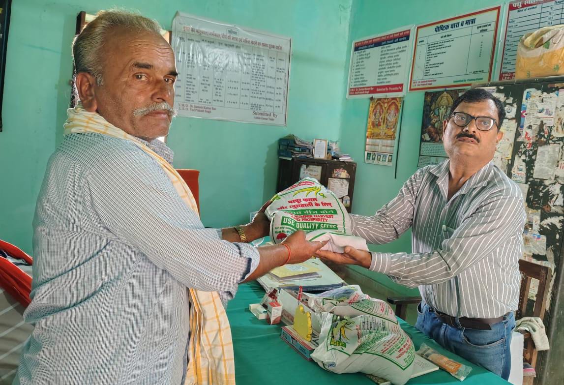 राजातालाब।आराजी लाइन विकासखंड क्षेत्र के शाहंशाहपुर स्थित राजकीय पशुधन एवं कृषि प्रक्षेत्र कार्यालय पर अतिरिक्त चारा विकास योजना के अंतर्गत पशुधन प्रसार अधिकारी डॉक्टर वेद प्रकाश सिंह ने क्षेत्र के प्रगतिशील पशुपालको को पशुओं को चारा खिलाने हेतु ज्वार बीज का मिनी किट वितरण किया। उसके साथ-साथ डॉक्टर वेद प्रकाश सिंह ने पशुओं को गर्मी से बचाव तथा रखरखाव के बारे में सभी पशुपालकों को विस्तार पूर्वक जानकारी दी।